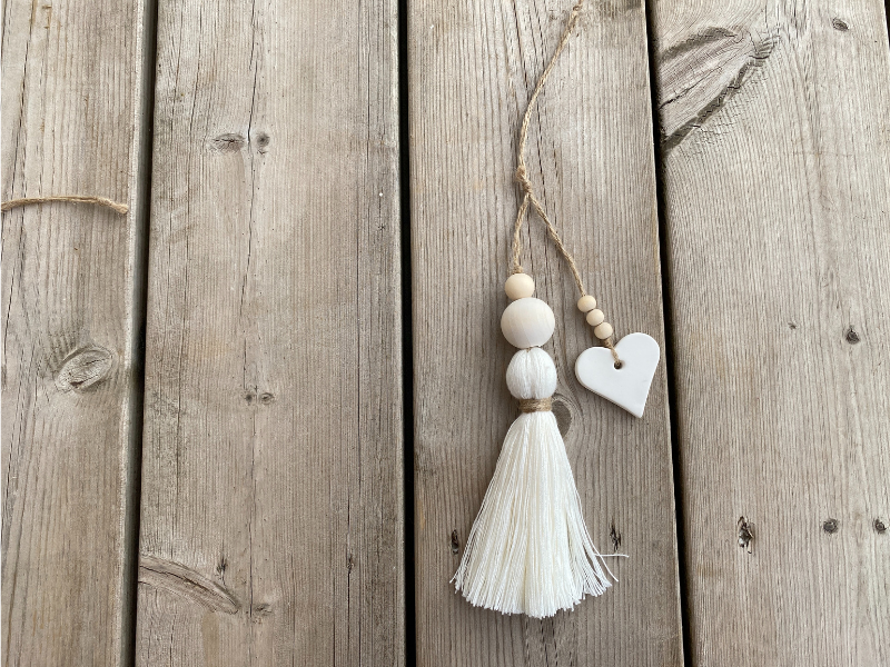 Bijou de porte , forme pompon en fil de bambou crème, et cœur en argile.