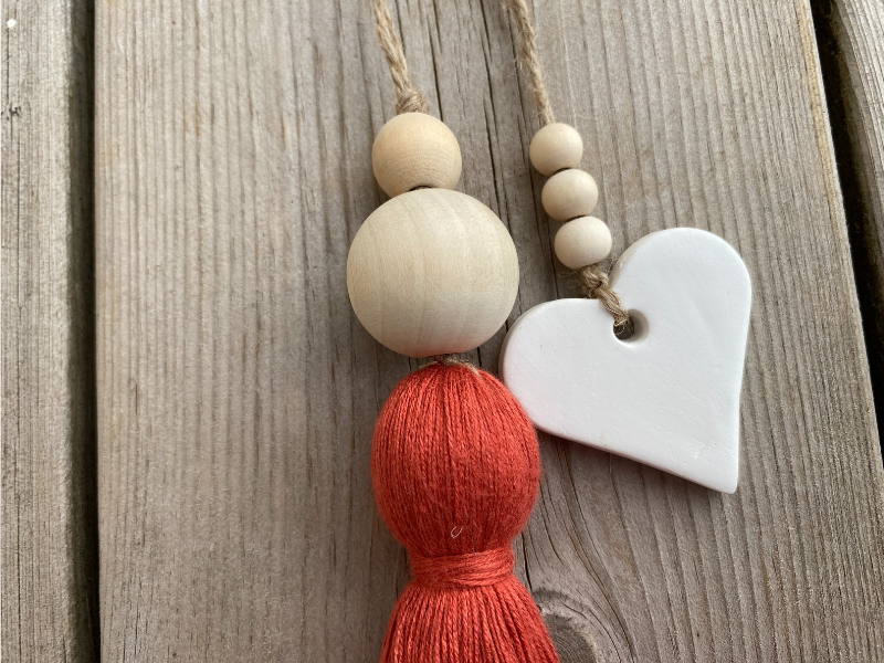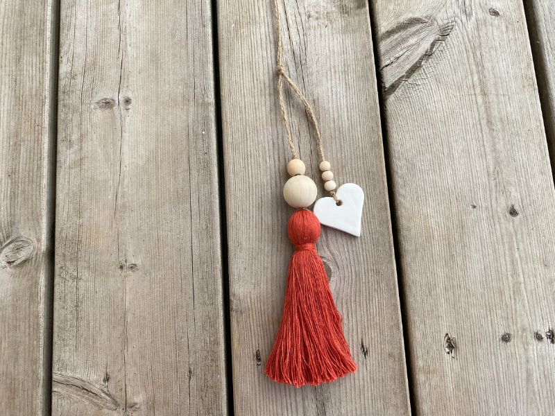 Bijou de porte , forme pompon en fil de bambou corail et cœur en argile.