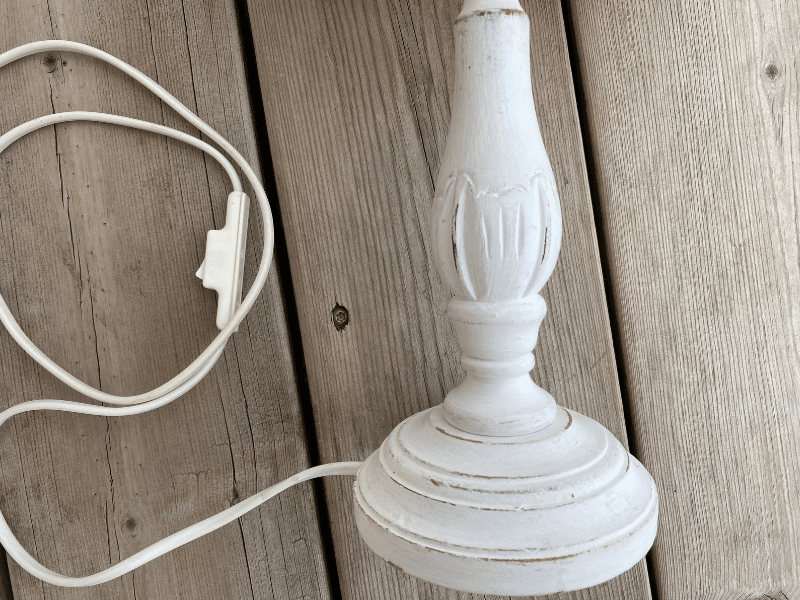 Le pied de lampe en bois peint blanc est recyclé, d'une hauteur de 30 cms, la hauteur totale avec l'abat jour est de 40 cms