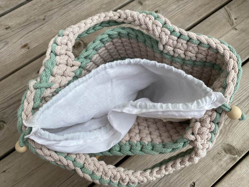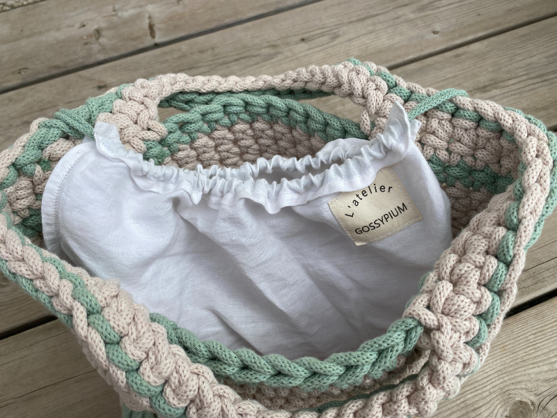 Sac en crochet, fil coton tressé recyclé écru et vert d’eau.pochette intérieure en tissus recyclé
